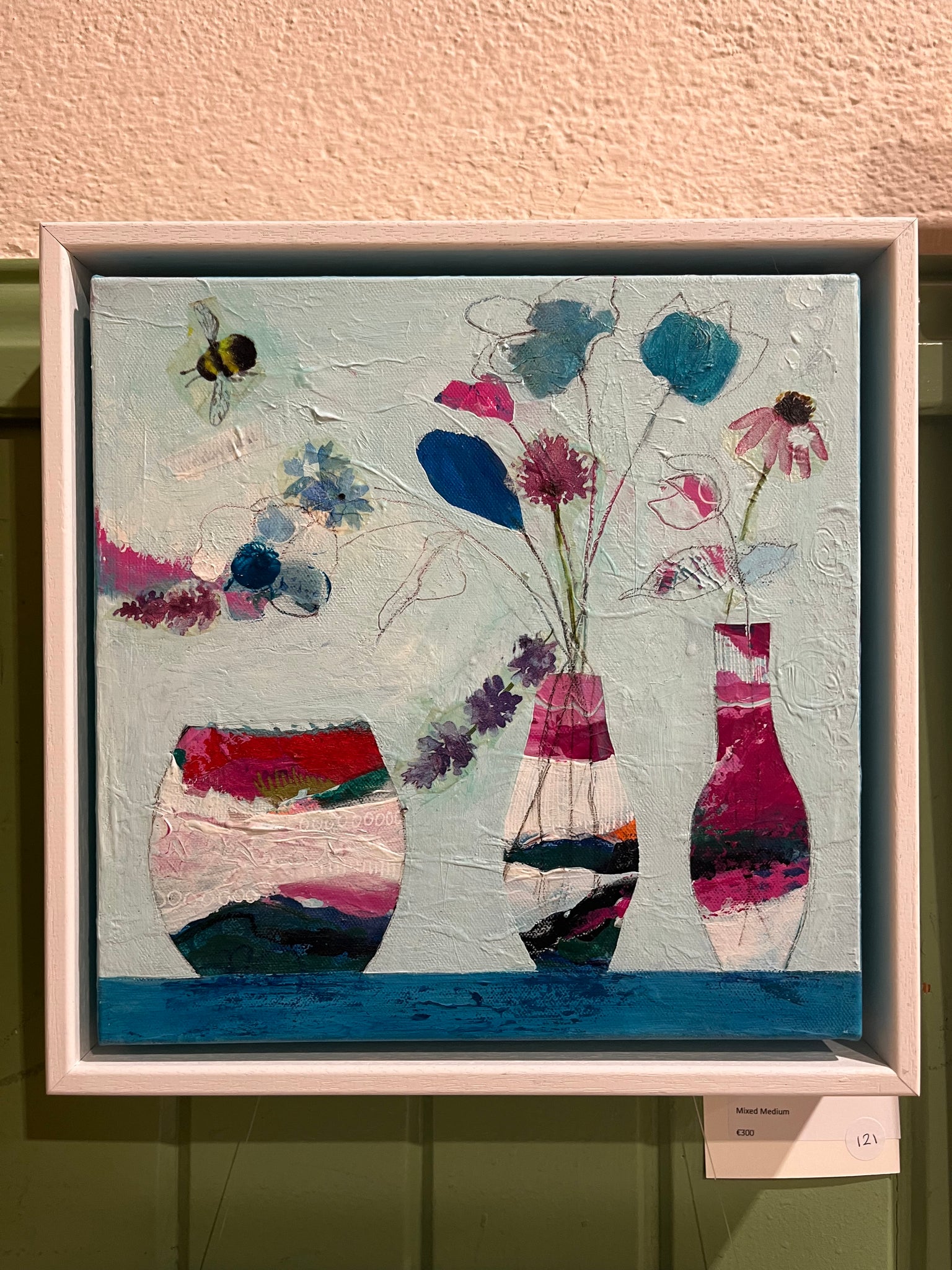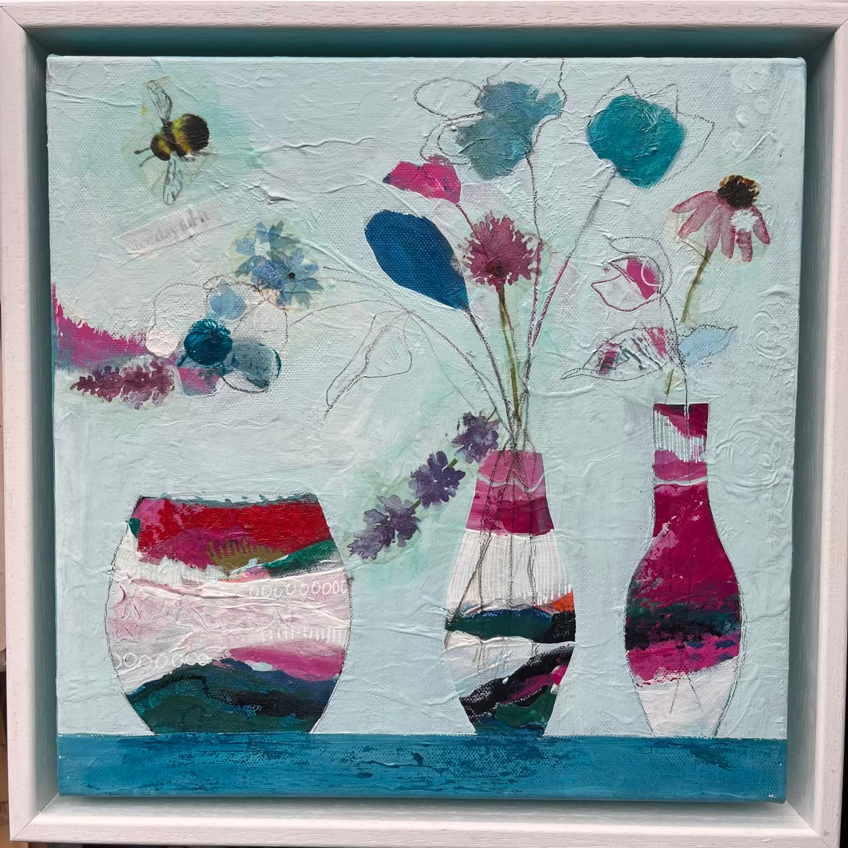 Acrylics, collage, ink, pencil, pens | 200x200mm Beech Panel  |  Framed in white tray frame.